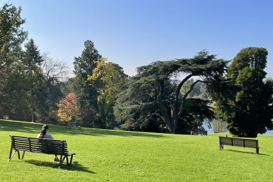 We are standing in front of a broad green lawn that stretches out ahead of us, dotted with benches that invite visitors to pause and take in the scenery.