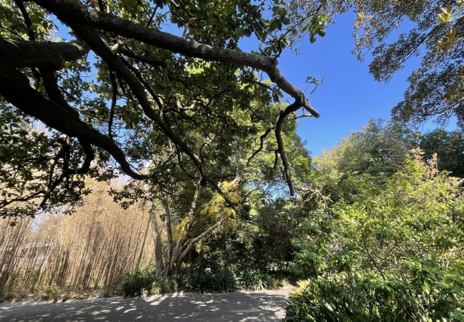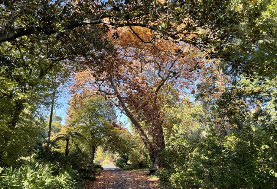 Before we stepped into the shaded Fern Gully, we came across a lovely open space with benches, inviting visitors to sit and rest. Towering above the grassy area are magnolia trees, their broad, glossy leaves catching the autumn light. Even though it’s fall and the flowers are mostly gone, the magnolias’ stature and structure give the space a sense of elegance and calm.