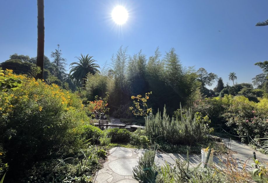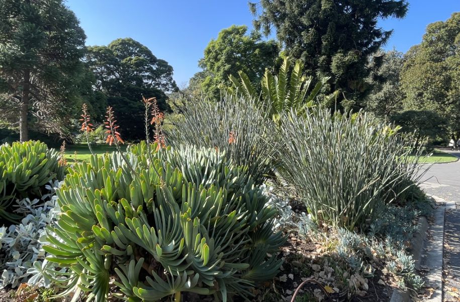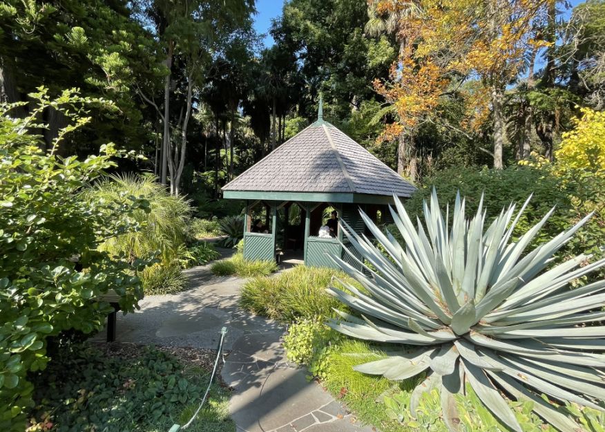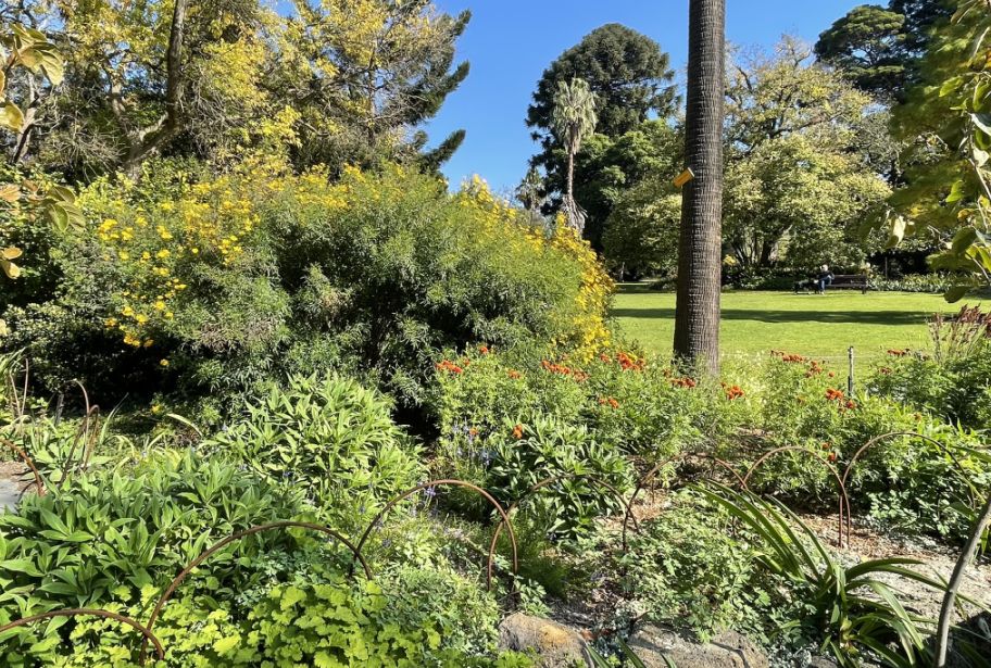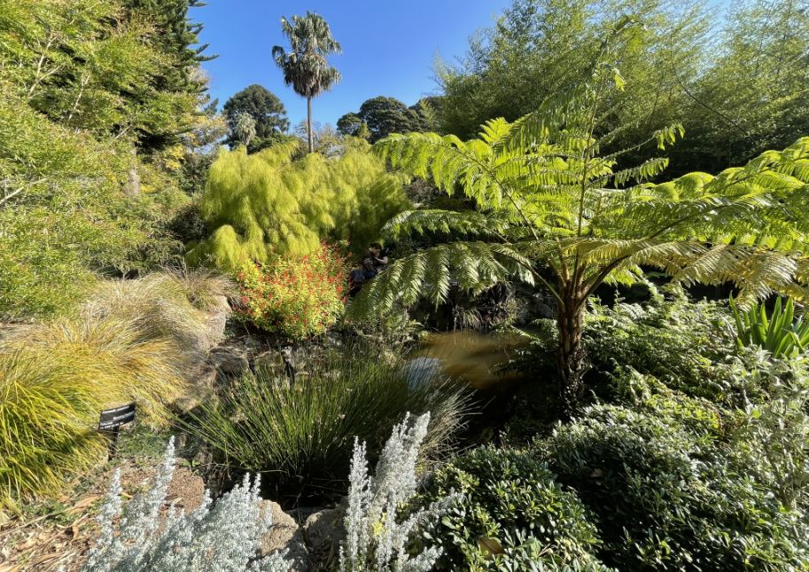 We have reached the Ian Potter Foundation Children’s Garden, which includes the Sensory Garden, a space designed to engage touch, smell, sight, and sound. The green hut you see is part of the garden’s playful structures, inviting kids (and adults!) to explore, hide, or rest in between discovering the plants.
