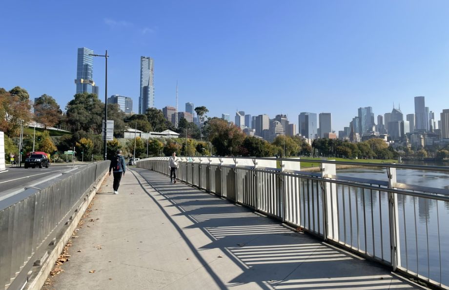 Here we are crossing Swan Street Bridge, and from there you get one of those sweeping Melbourne views where city and river come together. The Yarra flows just beneath on the right side, and beyond it, the skyline rises with a cluster of tall buildings, from the sleek glass of the modern towers to the familiar outline of the Eureka Tower, all set against the open sky.