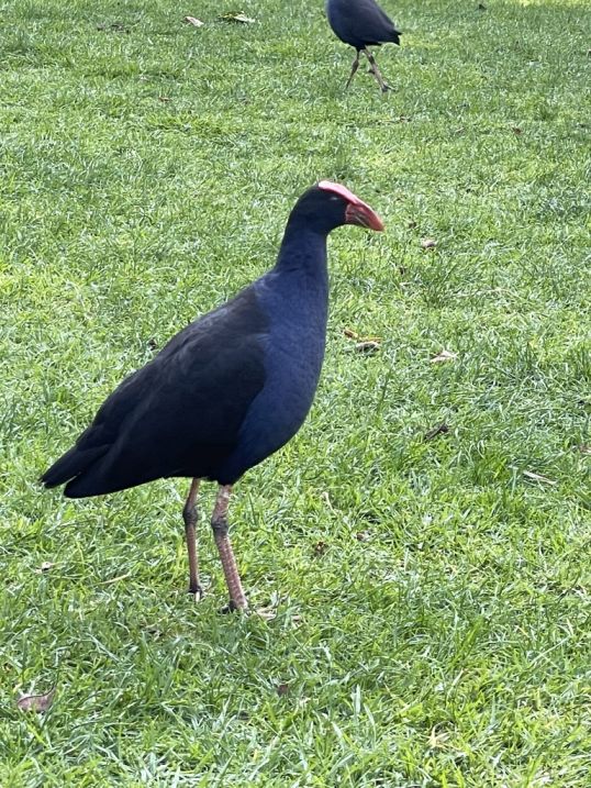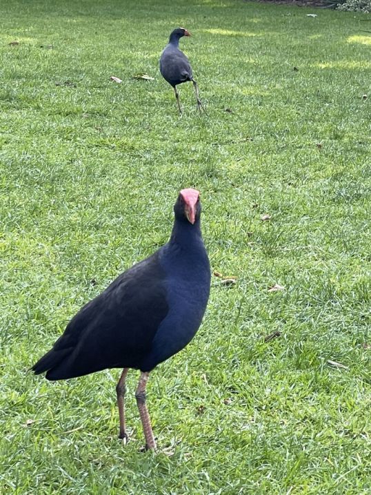 On the law are Australasian Swamphens, sometimes called purple swamphens. They’re striking wetland birds, easy to spot in the Royal Botanic Gardens. They have deep blue-purple plumage, a bright red bill and forehead shield, and long reddish legs with oversized toes, perfect for walking across reeds and marshy ground. Swamphens are quite social and bold; you’ll often see them strutting confidently across lawns or tugging at plants along the water’s edge. They feed mainly on reeds, grasses, and shoots, but they’ll also eat insects, snails, and even small aquatic animals. They’re part of the everyday rhythm of the Gardens.