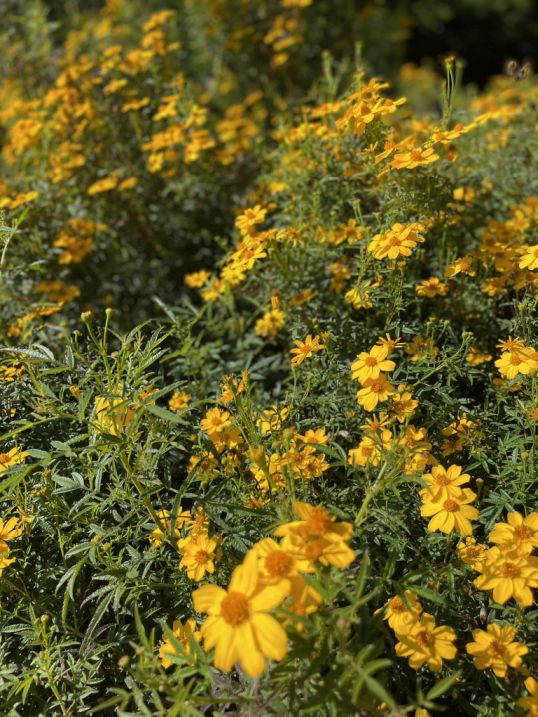 French lavender on the left and Mexican Marigold still gorgeous in a bright yellow.