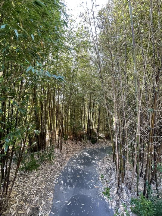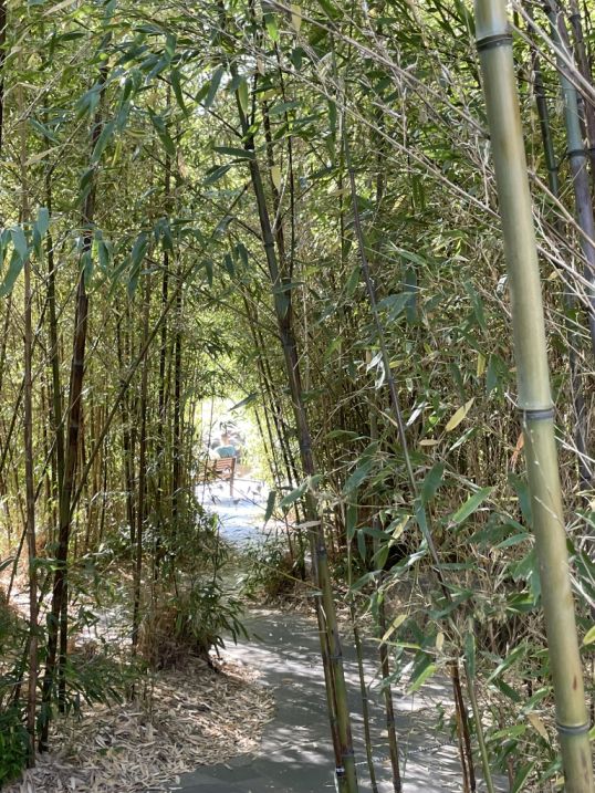We stepped into a bamboo-lined pathway, where the tall, slender stalks rise closely together on either side. Their green canes sway gently in the breeze, and as they knock against one another, they create a soft, hollow rustling sound that’s almost musical. At the end there is a bench for people to sit and admire the Lake.
