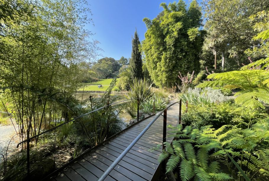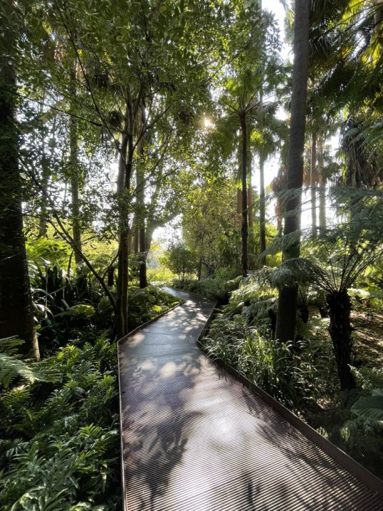 The wooden path elevates you just enough to appreciate the layers of plant life, from low-lying ground ferns to the mid-height clumps and finally the towering tree ferns. Light filters through the canopy, creating moving patterns on the fronds, and the combination of textures, shapes, and greens gives the feeling of walking through a miniature rainforest tucked into the heart of Melbourne.