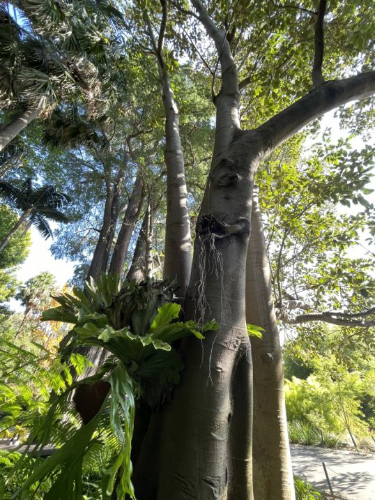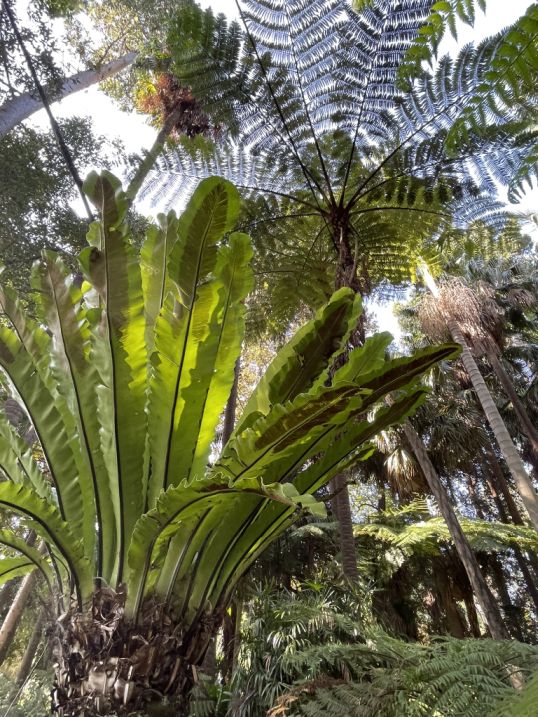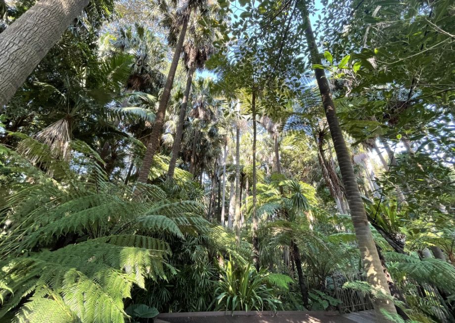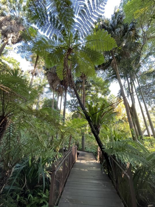 As we stepped into the Fern Gully, we entered a dramatically different world from the open lawns and avenues. Towering tree ferns rise on either side of the path, their long, feathery fronds creating a green canopy. Interspersed among them are other shade-loving giants, cycads, and palm trees.