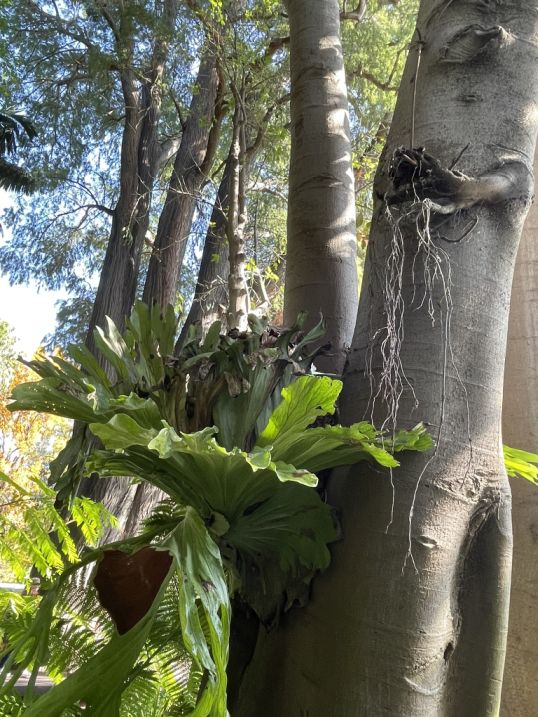The elkhorn fern (Platycerium bifurcatum) is very common in the Royal Botanic Gardens. They grow in clusters on tree trunks, with their shield fronds (round, flat leaves) pressed against the bark, helping them anchor. From the center, long green fronds fan outward like antlers, giving them that dramatic shape. They’re epiphytes, meaning they don’t take nutrients from the tree but gather moisture and organic matter from the air and rain. In Melbourne’s gardens, they’re often used to create a lush, tropical look, especially in shady areas like the Fern Gully.