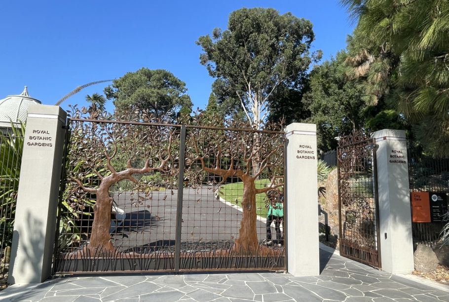 Ahead stands the ornamental metal gate of the Royal Botanic Gardens, its design adorned with stylized trees and the garden’s name worked elegantly into the iron.