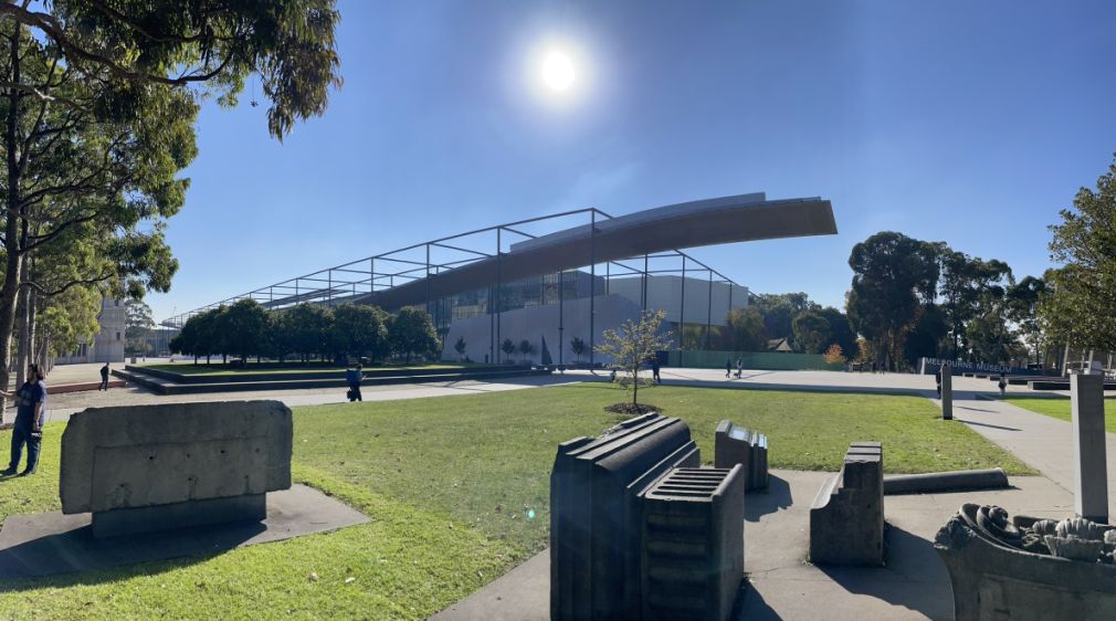 The Melbourne Museum is a post-modernist building designed by Denton Corker Marshall architects and the long blade-shaped form you’re seeing is one of the most striking features in the outdoor displays near the Melbourne Museum and Royal Exhibition Building. It is called “Blade Wall” (sometimes simply called the Blade).
