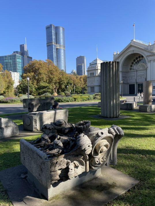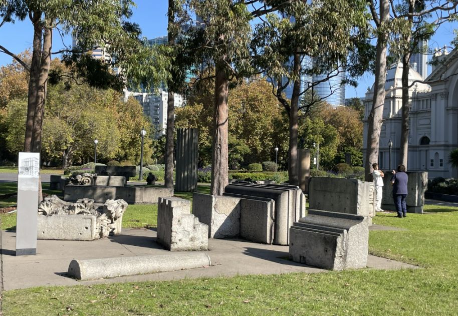 These are architectural fragments, old columns, carved capitals, pediments, and headstones were salvaged from demolished 19th-century buildings around Melbourne.