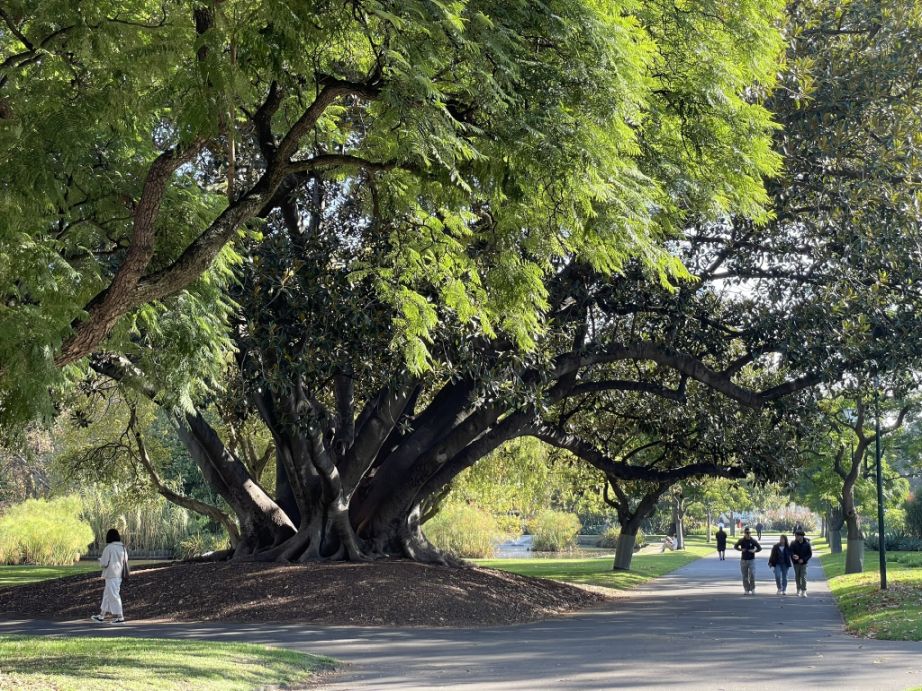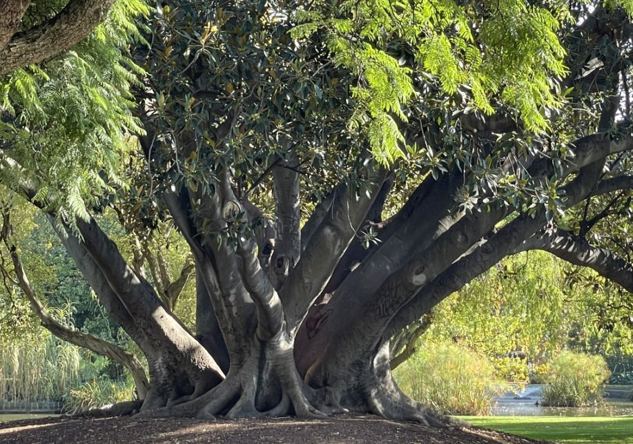 We are now in the Carlton gardens with a big Moreton Bay fig (Ficus macrophylla), one of the giants of the Carlton Gardens. Native to the subtropical rainforests of Queensland and New South Wales, it was a popular choice in 19th-century Melbourne when planners wanted to add grandeur to public gardens.