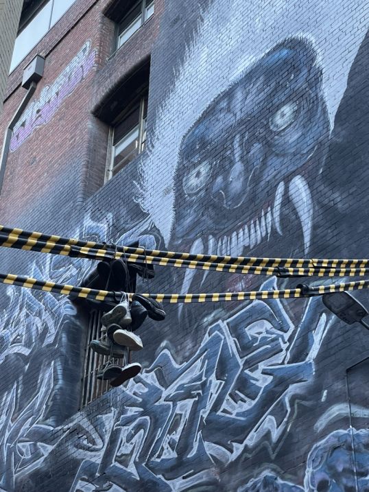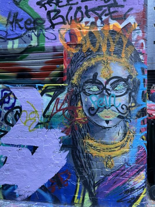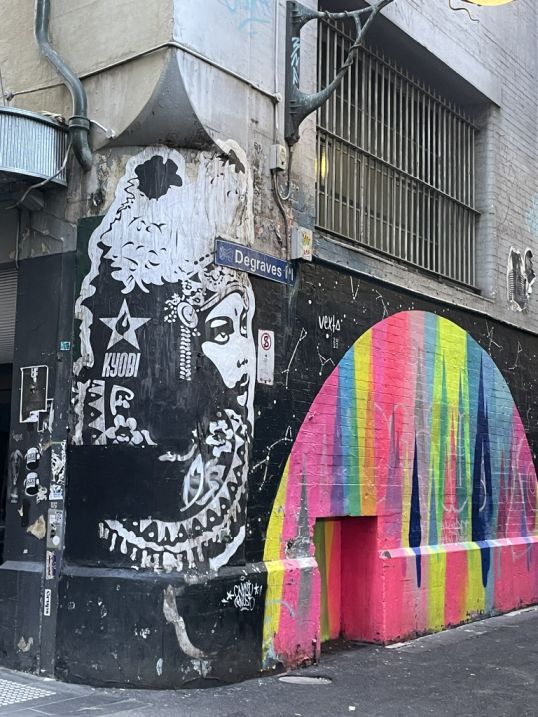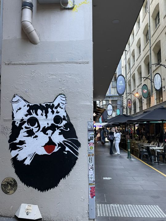 We are on Degraves Street, one of Melbourne’s most famous laneways, buzzing with life, art, and café culture. The black-and-white cat’s head is part of the rotating street art scene in the laneways around Degraves and Centre Place. These walls are like an open-air gallery, constantly being repainted with new murals, from political messages to surreal art and playful designs like the cat.