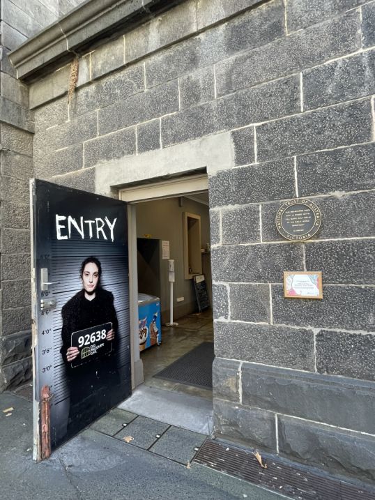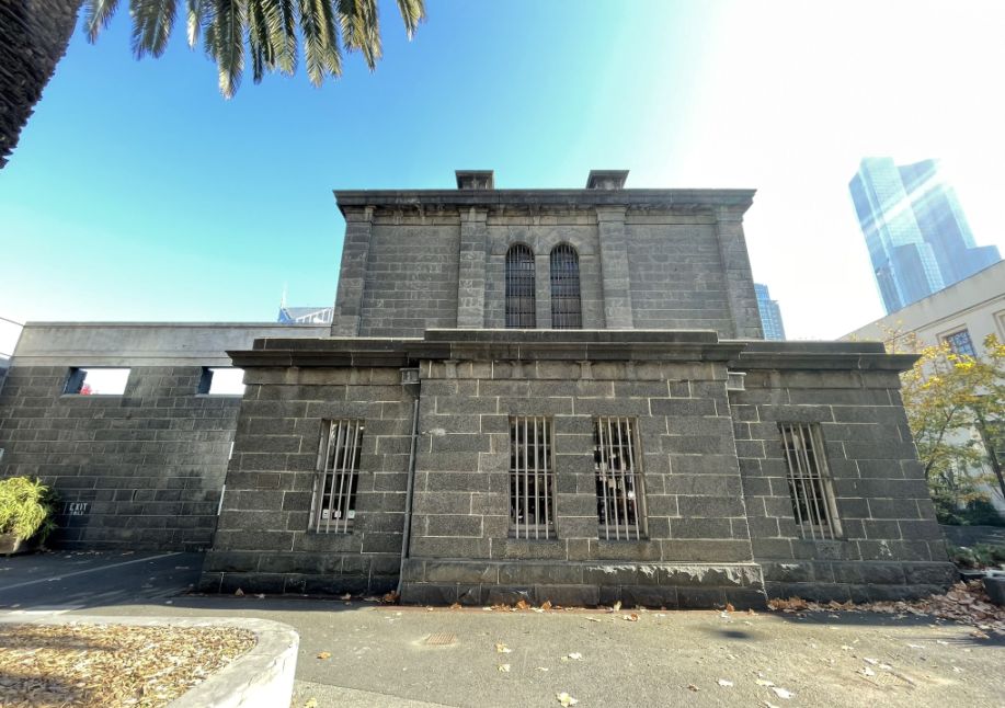 The Old Melbourne Gaol is a grey two-story bluestone building located along Russell Street. Built from bluestone, a volcanic rock commonly used in 19th-century Melbourne, which gives it that grey, heavy appearance. The architecture is stark and austere with thick walls, small barred windows, and minimal decoration, very much in line with its purpose as a colonial prison.