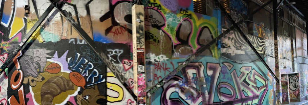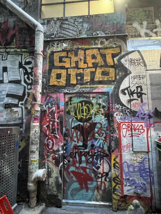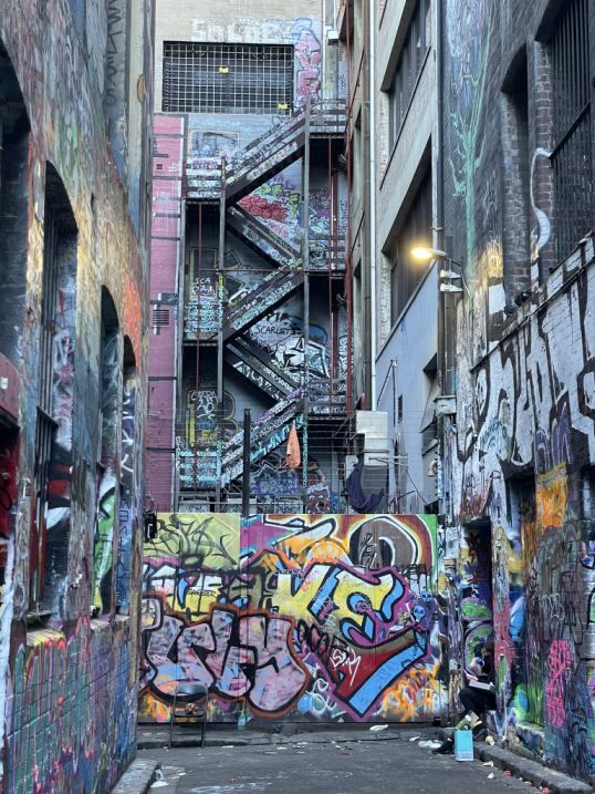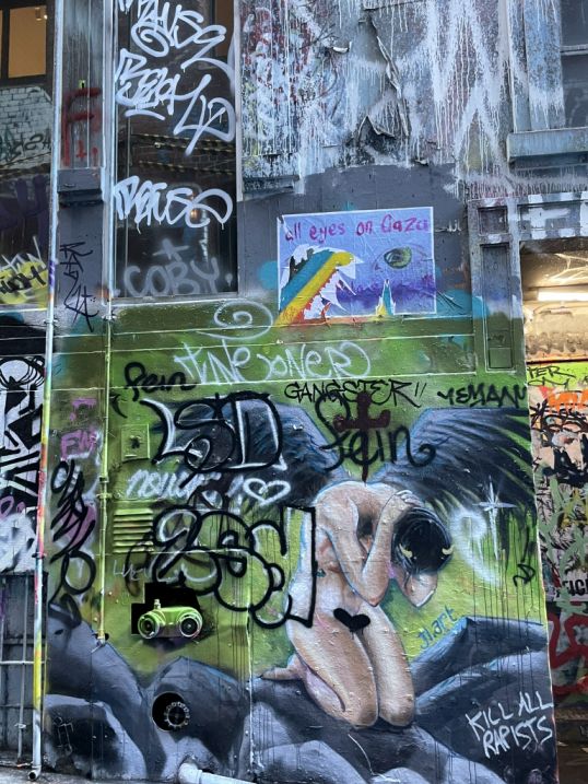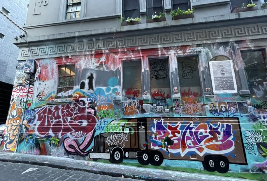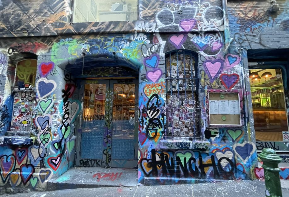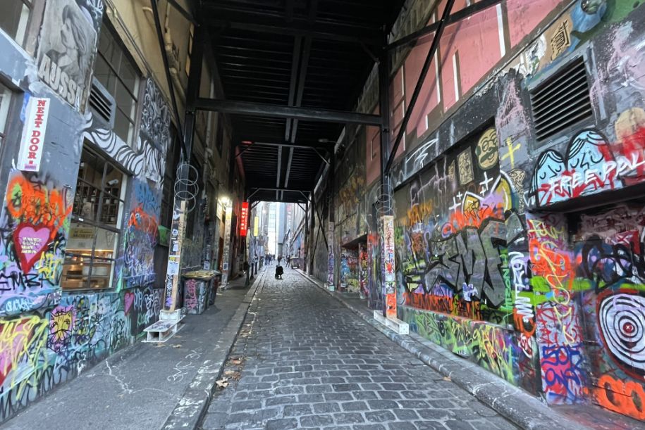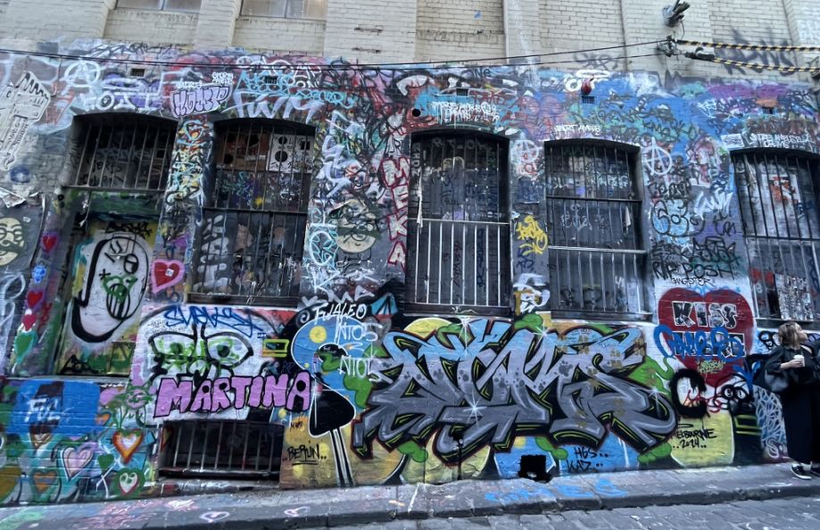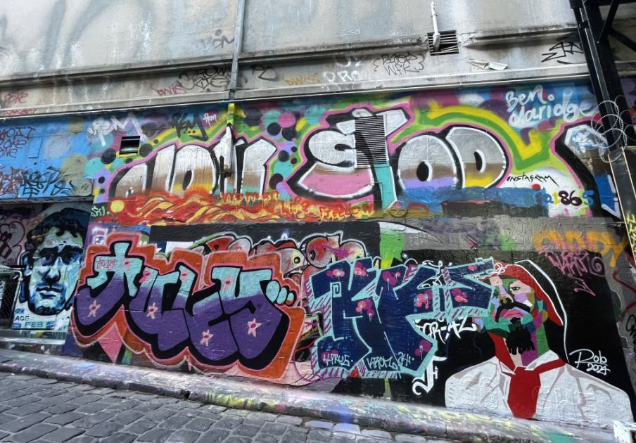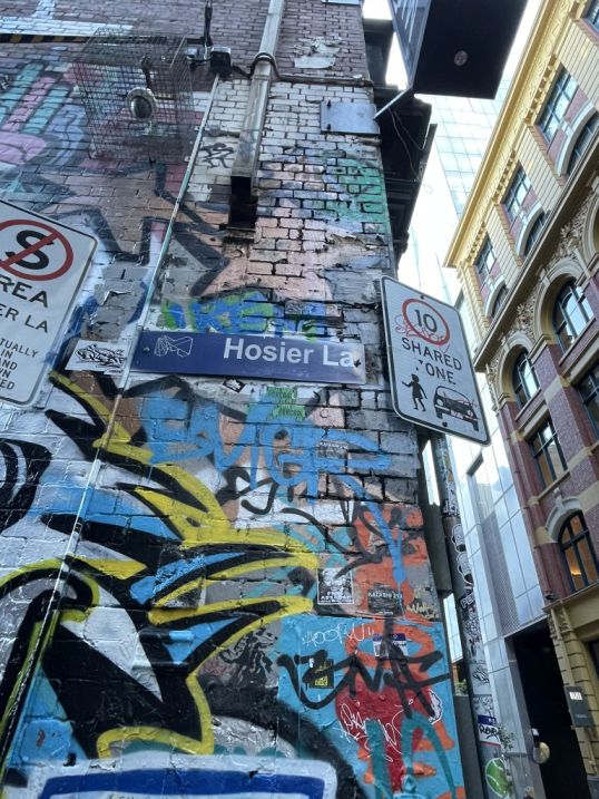 Unlike Degraves, which mixes cafés and murals, Hosier is almost entirely devoted to graffiti and murals, with every brick, window frame, and even garbage bin covered in layers of paint.