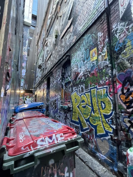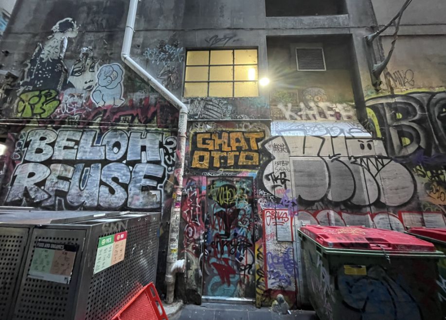 Even the garbage bins in Hosier Lane become part of the art. Instead of plain green or black surfaces, they’re covered in tags, stickers, and layers of spray paint, often blending so well with the walls that they almost disappear into the scene.