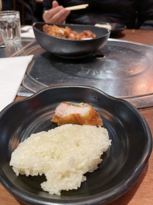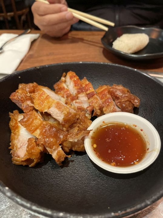 Crispy BBQ pork with crispy skin and served with sticky rice.