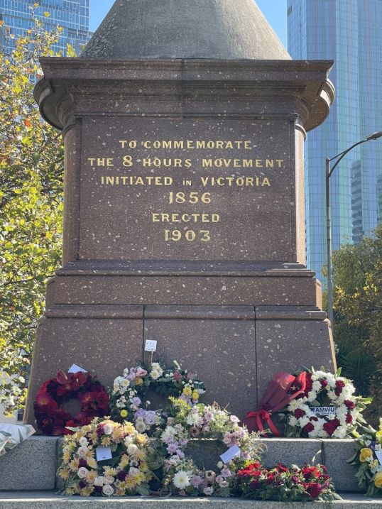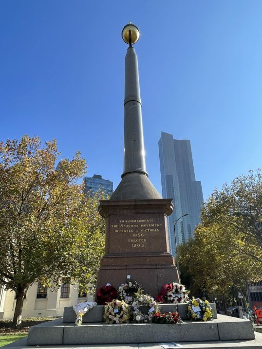 The 888 Monument, near the Old Melbourne Gaol and RMIT, commemorates the Eight Hour Day Movement, one of the most important labor rights campaigns in the world. It stands for the workers’ demand in the mid-1800s: “8 hours work, 8 hours recreation, 8 hours rest.” These are often placed there during commemorations, especially around Labor Day with unions workers, and community groups often hold ceremonies and lay flowers or wreaths at the base of the monument.
