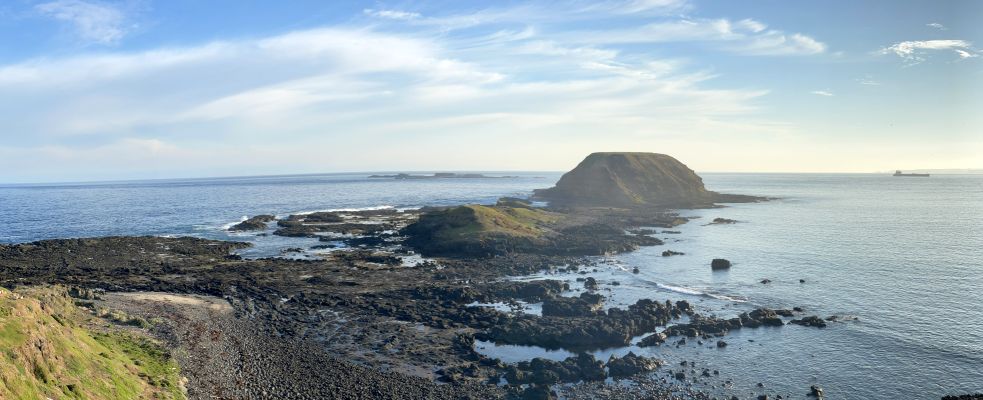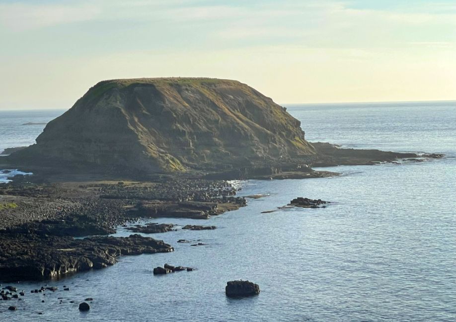 The Nobbies are named after the large dome-shaped rock formations that rise dramatically from the ocean just off the coast. These rugged basalt outcrops were formed millions of years ago by volcanic activity and now stand as striking landmarks against the crashing waves. The surrounding area is equally stunning, with windswept cliffs, rolling green headlands, and seabirds circling above, all framed by the endless expanse of Bass Strait.
