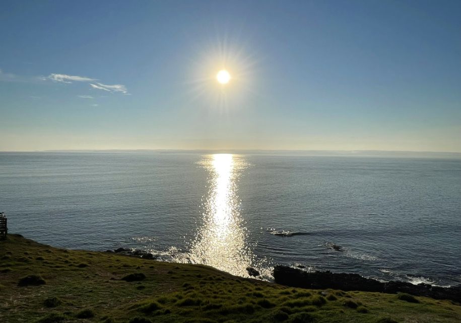 Around 4 to 5 pm, the sun began to dip toward the horizon, casting a golden glow across the cliffs and ocean, with shimmering reflections dancing on the water