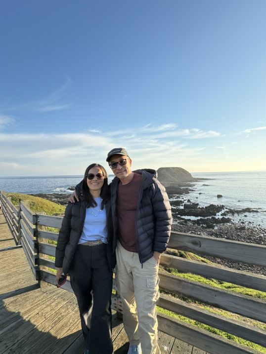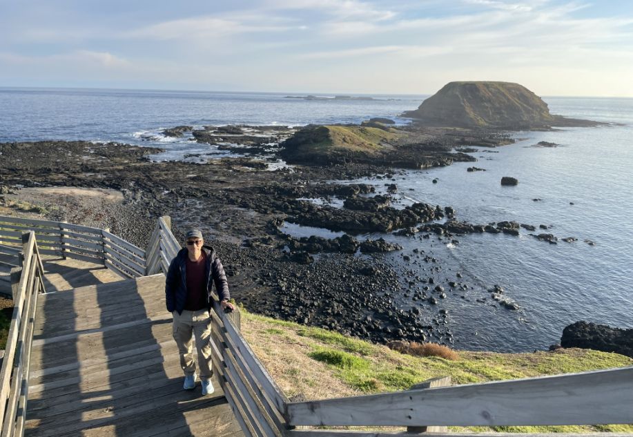 Hoa leaning against the wooden rail with the Nobbies’ rugged cliffs and rocky outcrops rising beautifully in the background.