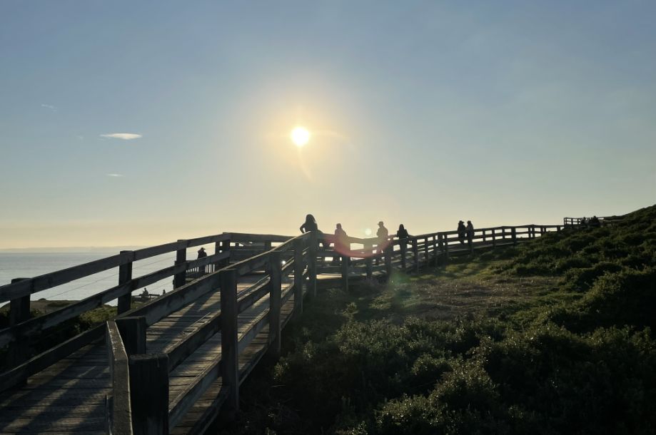 As we walked along the wooden boardwalk, the view is breathtaking. The sun sinks lower on the horizon, casting a golden glow across the water, while the waves shimmer with light.