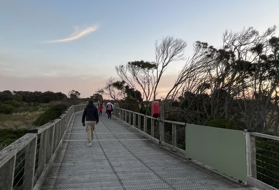 Once the first groups of penguins emerge from the sea and begin their waddle up the sand, the viewing experience doesn’t end there. Visitors can continue watching them by following the boardwalk platforms that wind through the dunes. The pathways are raised to protect the fragile habitat, but they bring you surprisingly close to the penguins as they make their nightly journey inland. Walking along the platform, you see penguins just a few feet away, some slipping under the boardwalk, others crossing right beside it to reach their burrows. The design of the pathways means you can follow the penguins without disturbing them, almost as if you’re traveling alongside them on their return home. It feels like being part of a quiet procession: people moving carefully on the platforms above, and the little penguins shuffling determinedly below, each one making its way back to the safety of its burrow for the night.