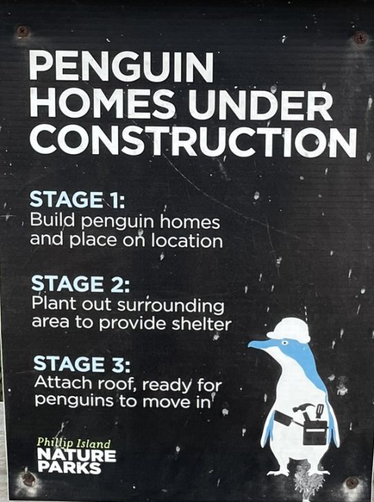 On Phillip Island, rangers and conservation staff sometimes build artificial penguin burrows to support the colony. These are small wooden or plastic nest boxes, placed in the dunes or among vegetation, that provide safe, dry spaces for the penguins to breed and shelter. They’re especially helpful in areas where natural burrows have been damaged or lost due to erosion, vegetation changes, or past human activity. This sign means that the park’s wildlife team is actively installing or repairing these burrows. The goal is to give the penguins extra protection and help the colony grow.