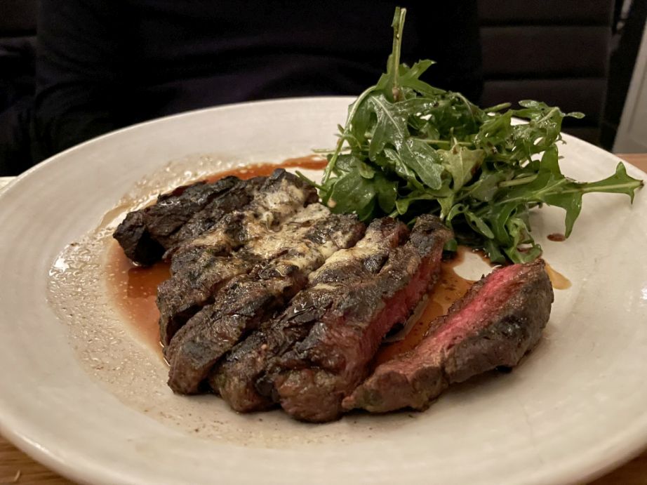 Flat iron steak (Gippsiand, pasture fed) , confit garlic butter, rucola, aceto balsamic.