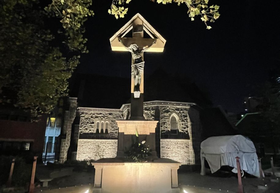 The figure provides a human warmth to the imposing façade, reminding visitors that behind the grand architecture lies a place of faith and reflection. Together, the building and sculpture create a powerful sense of both awe and serenity.
