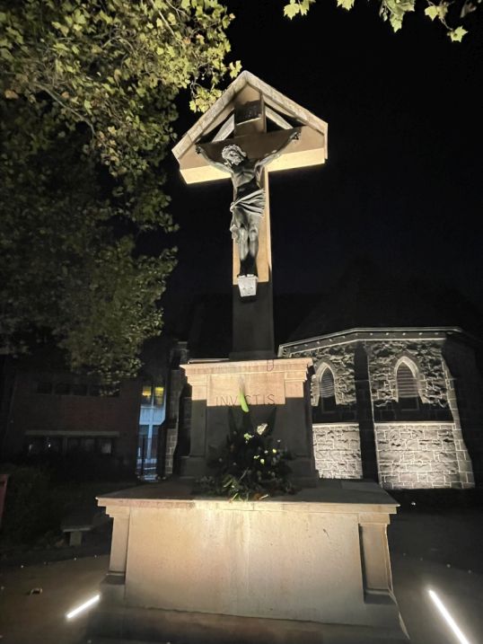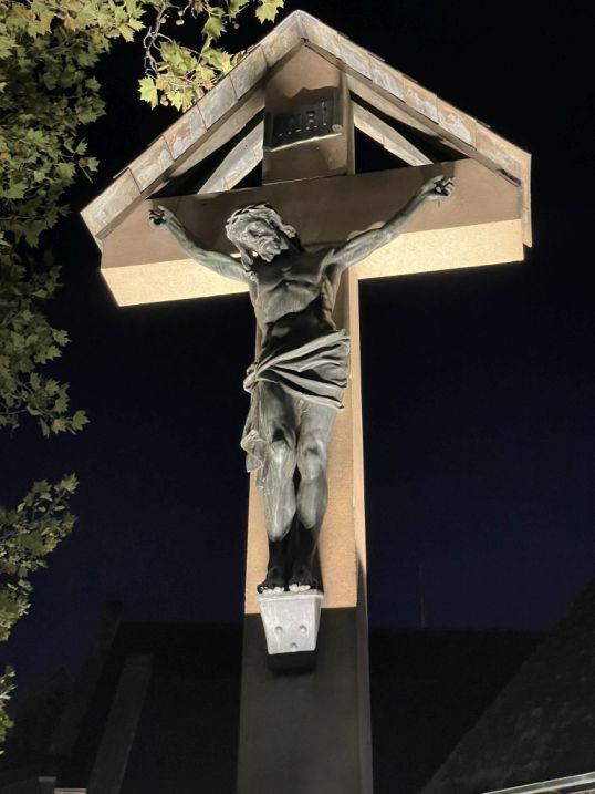 In front of the cathedral stands a striking sculpture of Jesus, arms outstretched in a gesture of welcome and blessing.