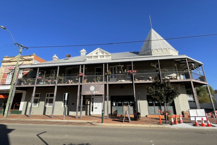This corner building is the Imperial Hotel (sometimes called the Imperial Homestead Hotel), is a big two-story hotel on Avon Terrace with the double verandahs/metal balconies and the little pointed roof pediment at the corner. It was built in 1886 in a Victorian-filigree style and has been a prominent Avon Terrace landmark ever since.
