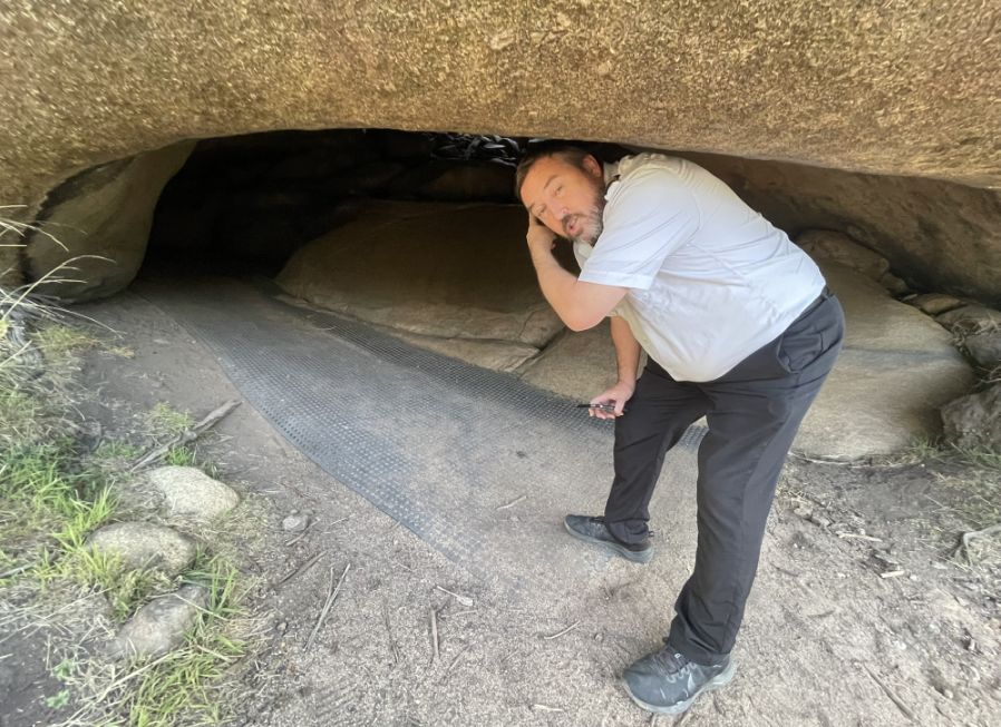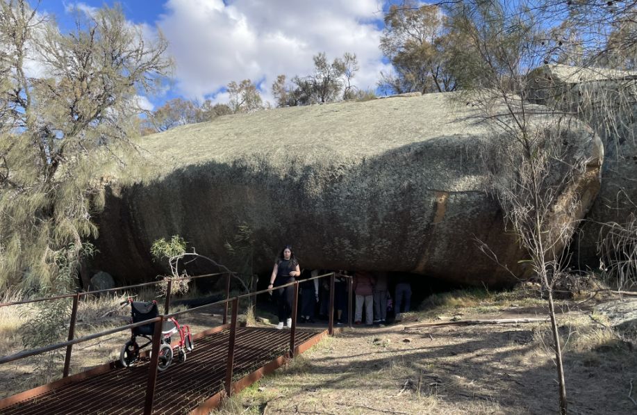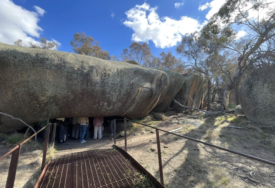 Inside Mulka’s Cave, the space feels cool and still, and the granite walls curve around you like a natural shelter. From where we are standing, we can see that the cave isn’t very deep, but the shapes of the rocks make it feel like a small maze carved into the stone.