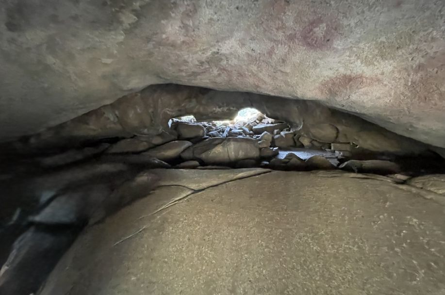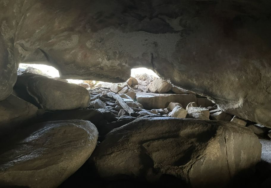 Scattered around the floor are large, rounded boulders, some leaning into the walls, others sitting like natural seats. They’ve been smoothed over time by weather and footsteps, giving the cave those familiar, curved granite shapes that are common in this landscape.