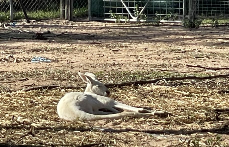 An Albino Kangaroo laying around the park. The white coloring is a result of a genetic condition called leucism (a partial loss of pigmentation) or albinism (complete lack of pigment). Seeing a white kangaroo in nature is extremely rare, making it a powerful symbol of uniqueness or the unexpected Australian experience.