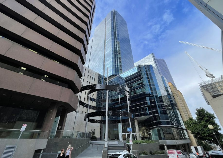 We are now walking along St George’s Terrace, and ahead of us stands a striking metal sculpture with three enormous black circles suspended in the air, each one held up by sleek white metal beams. The contrast of the black rings and white supports gives it a bold, modern look right in the middle of the city.
