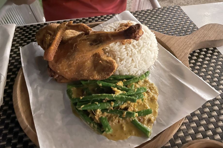 Hoa ordered a fried duck with rice and green beans. We can't wait to start our adventure in Bali.