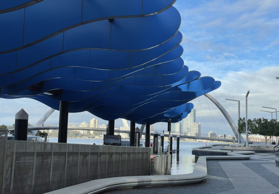 At Elizabeth Quay, the ferry station sits under a large blue canopy that curves like a wave, matching the water beside it and adding a splash of color to the quiet morning scene.