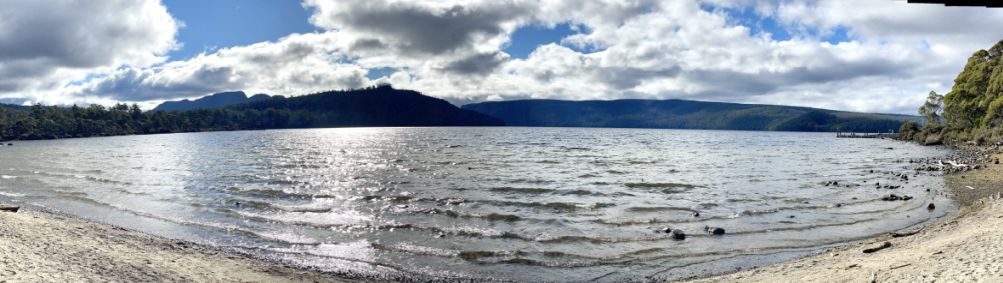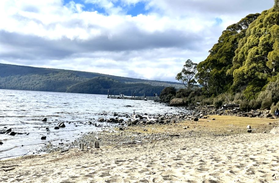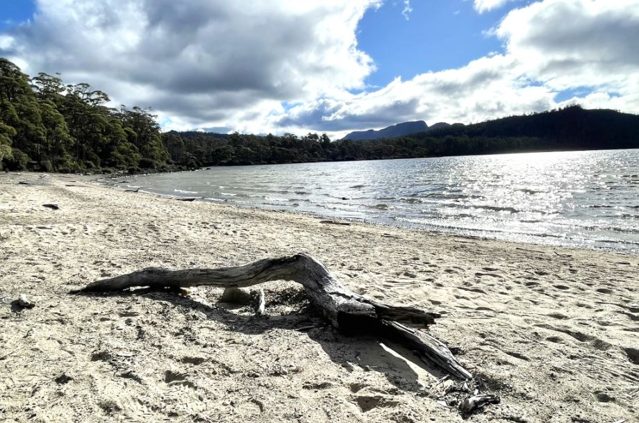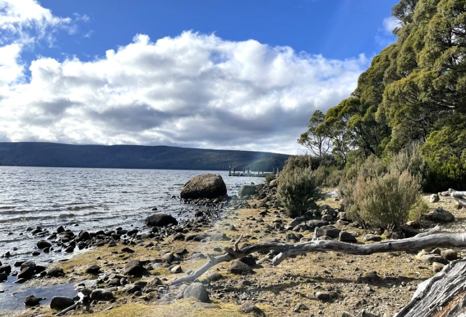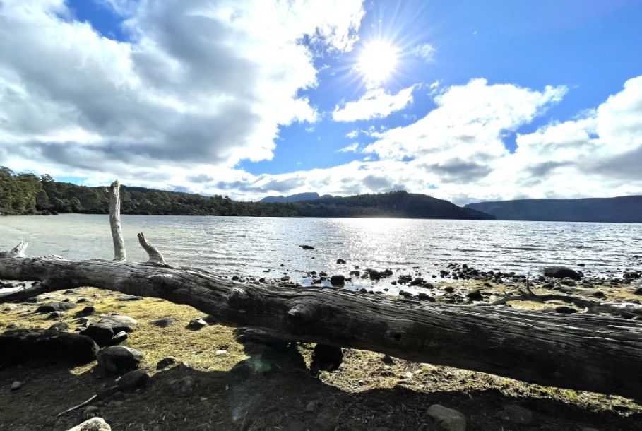 We sat down by the shore to take in the beautiful view of the calm lake. The water was perfectly still, everything felt peaceful. It was a quiet, soothing moment surrounded by pure Tasmanian wilderness.