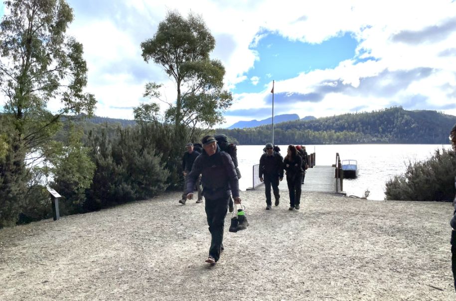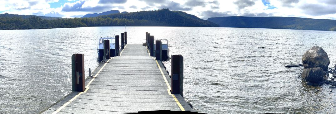 The wharf extends gently over the clear water and is used for boat tours, fishing, and sometimes for hikers starting or finishing the famous Overland Track, which ends here. As we were approaching the wharf, a bunch of people just got of the boat after hiking on the other side of the lake.