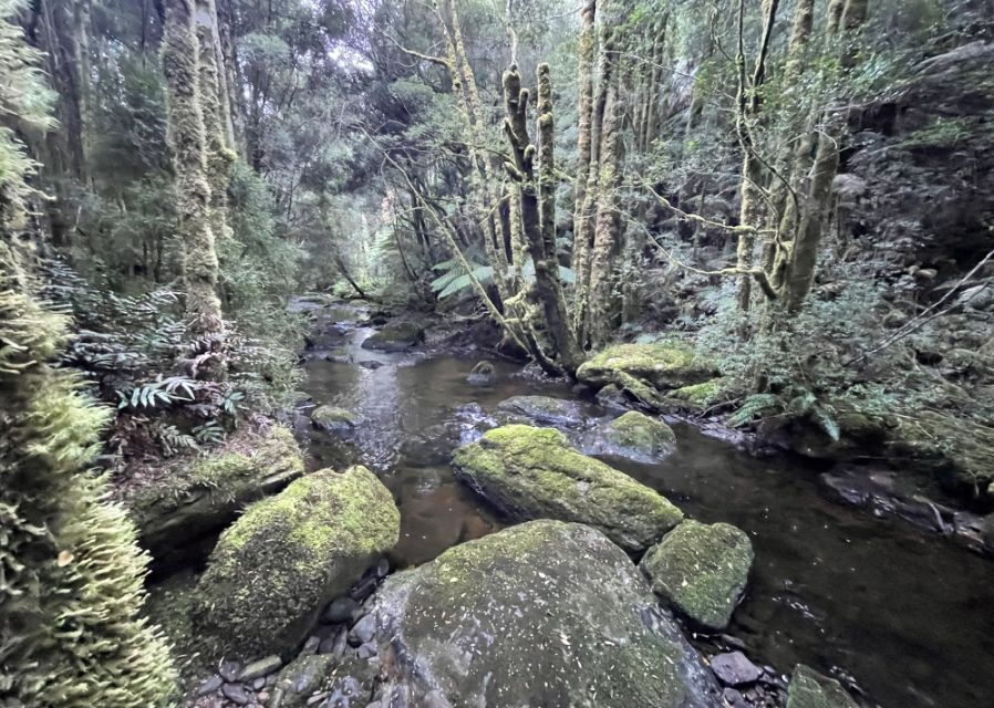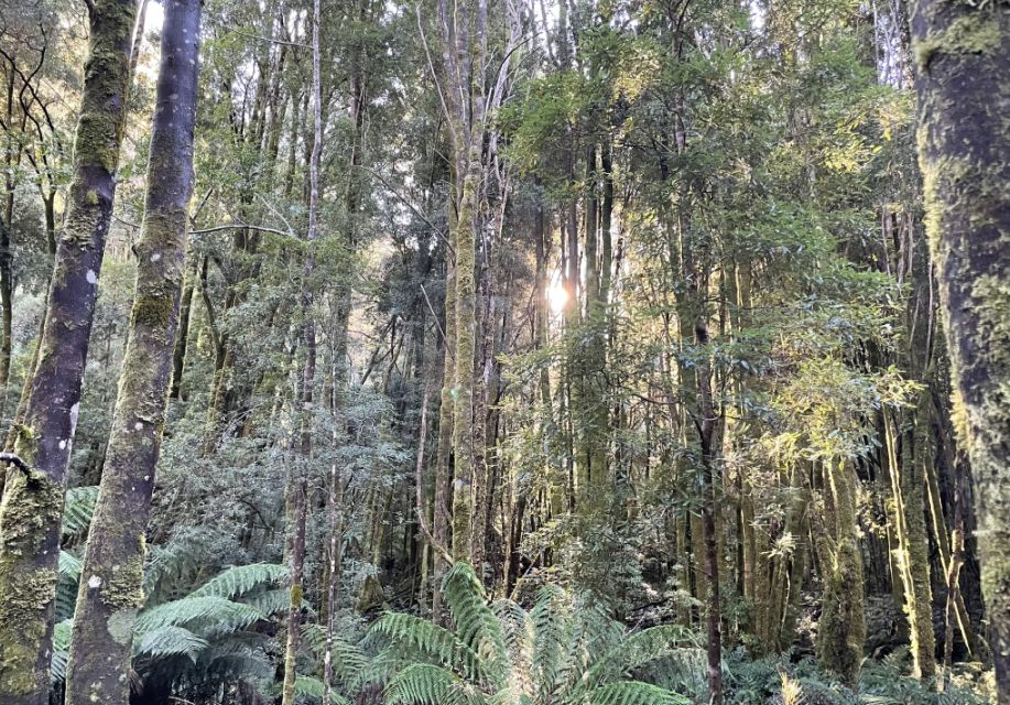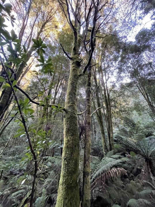 The dominant trees here are myrtle beech (Nothofagus cunninghamii), which have dark, glossy leaves and form much of the dense canopy. There are also sassafras, which gives off a faint, sweet scent when crushed, and leatherwood trees, known for their twisted trunks and creamy white flowers in summer.