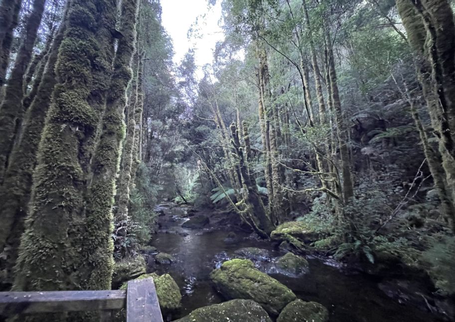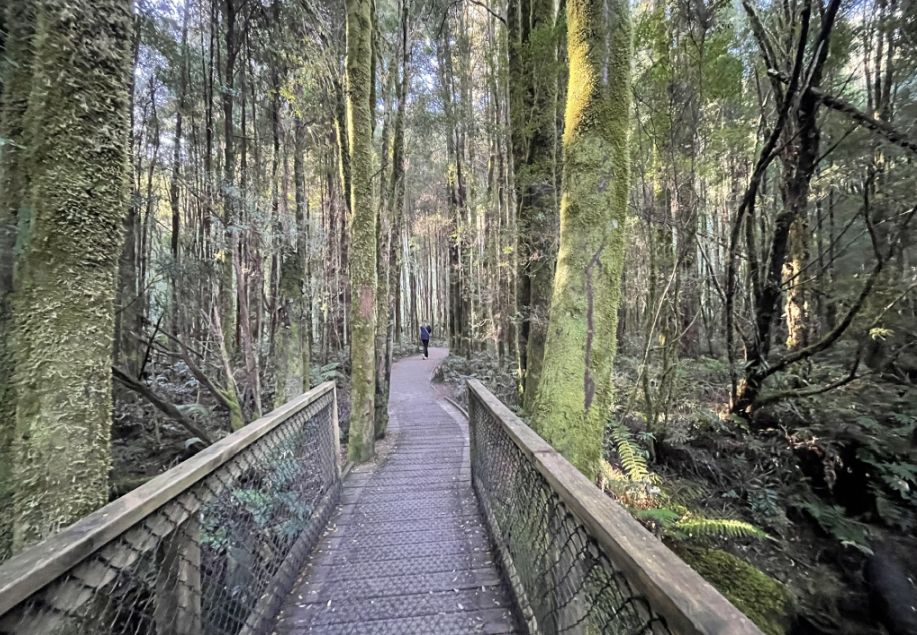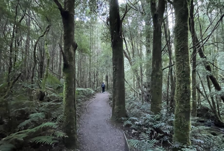 The pathway wound its way through tall myrtle beech trees, their trunks thickly covered in moss from base to branch. These ancient trees are characteristic of Tasmania’s cool temperate rainforests, thriving in the damp, shaded environment around Nelson Falls. Some sassafras and leatherwood trees also grow among them, adding variety to the dense forest canopy.