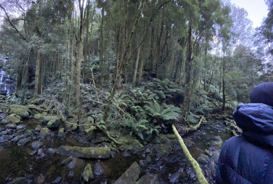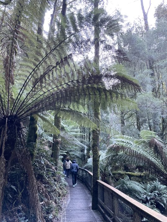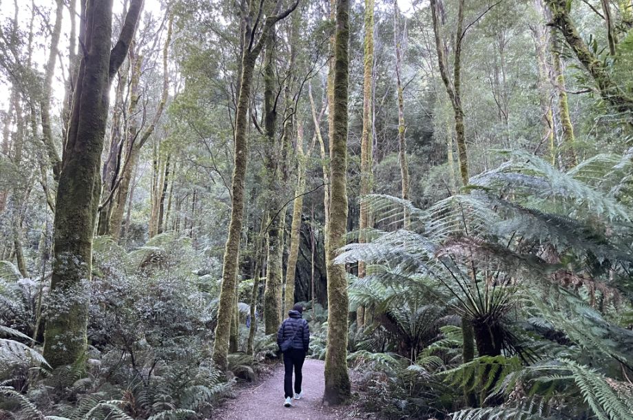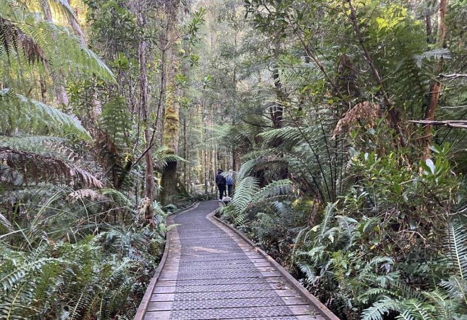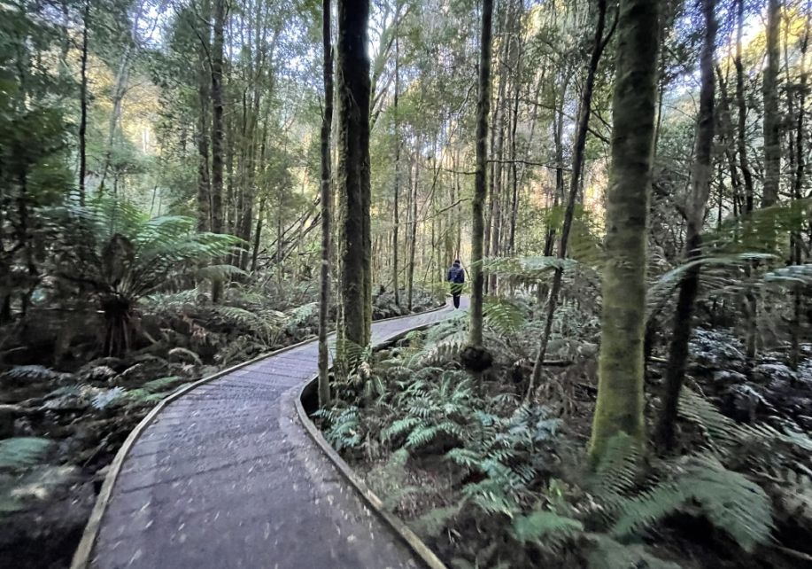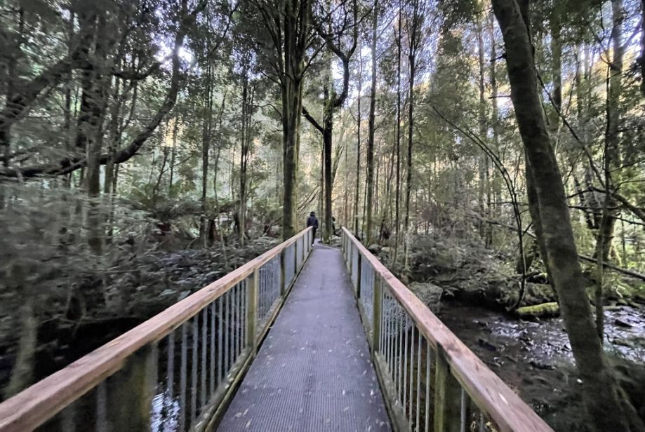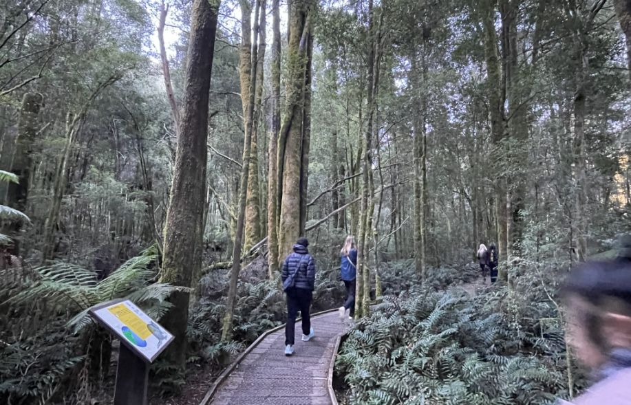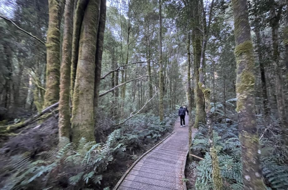 As we followed the well-kept wooden pathway toward Nelson Falls, we are now walking through a cool temperate rainforest filled with a mix of ancient Tasmanian tree species.