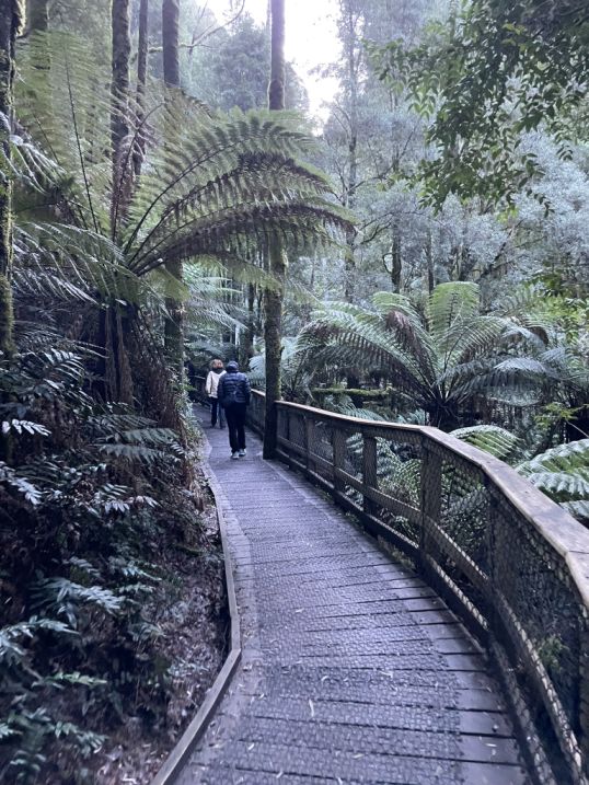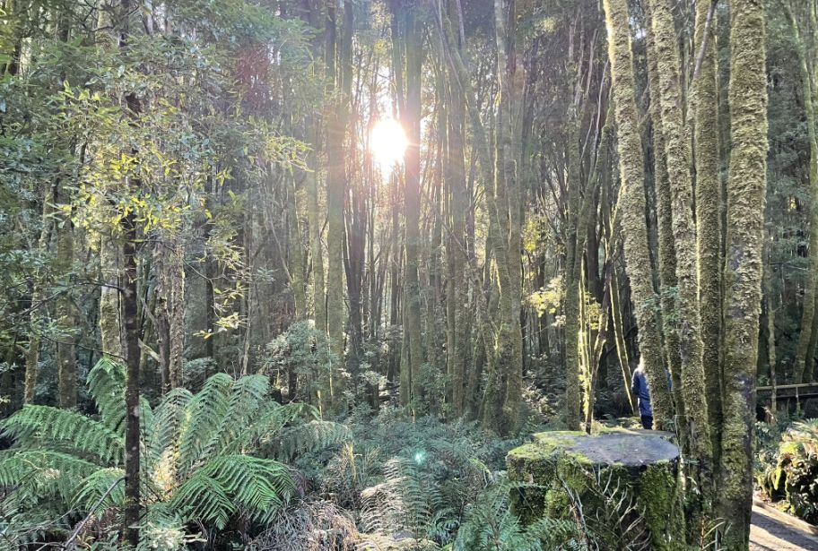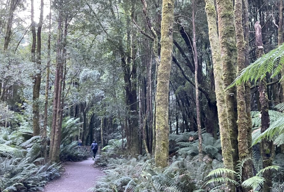 As we walked along the Nelson Falls Track, we followed a stream winding gently through the forest, its clear water glimmering between rocks and roots.