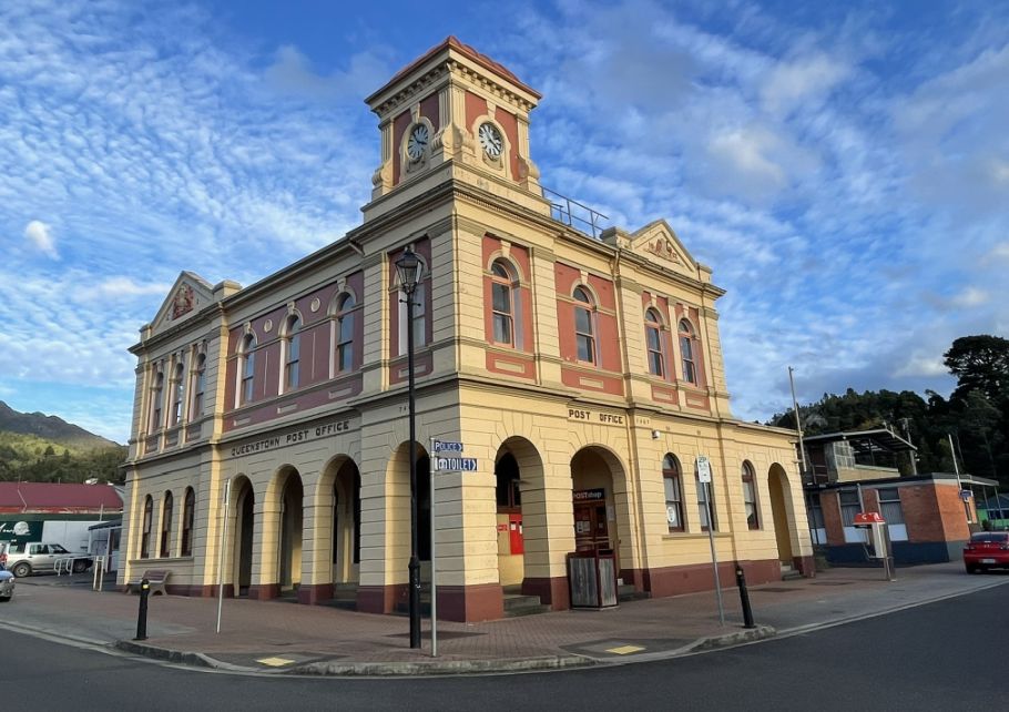 Architecturally, the building reflects Federation-era design, with its arched windows, decorative brickwork, and clock tower that once helped residents keep time in a town defined by long work hours and shifting mine schedules. The warm, earthy tones of its stone and brick façade blend beautifully with the surrounding mountains, giving it a timeless, sturdy character. Today, the Queenstown Post Office still stands as a reminder of the town’s prosperous past, and a symbol of how this remote mining settlement once connected Tasmania’s wild west coast to the rest of the world.