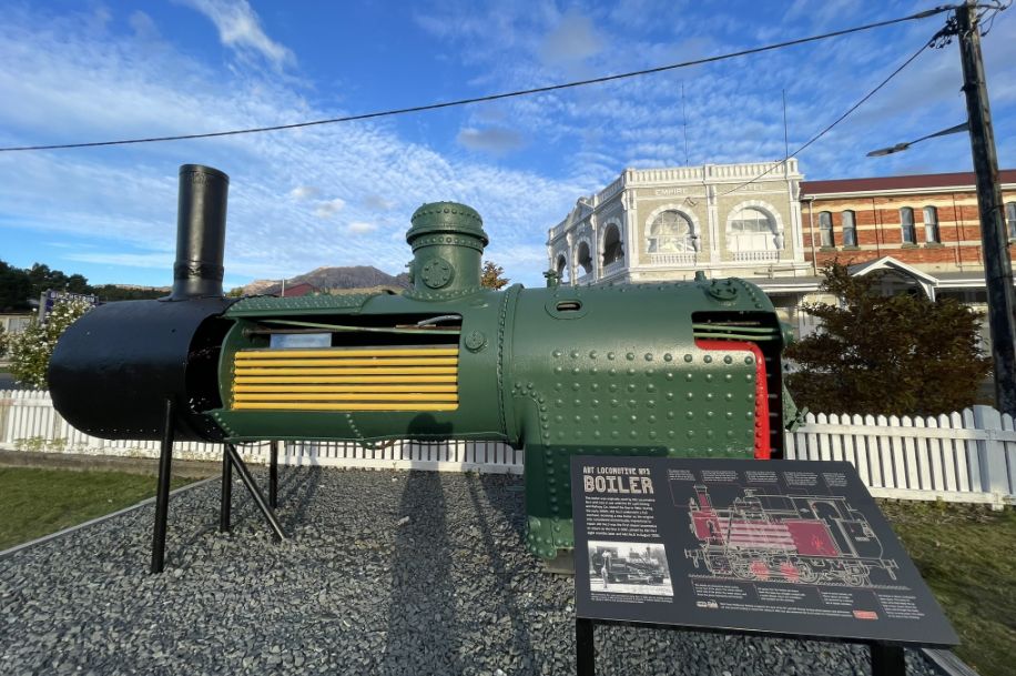 The green metal piece is the original pressure vessel of a locomotive that spent over 60 years hauling copper ore and passengers through the King River Gorge. It is a powerful industrial relic, representing the actual component that powered the engine during its entire first working life.