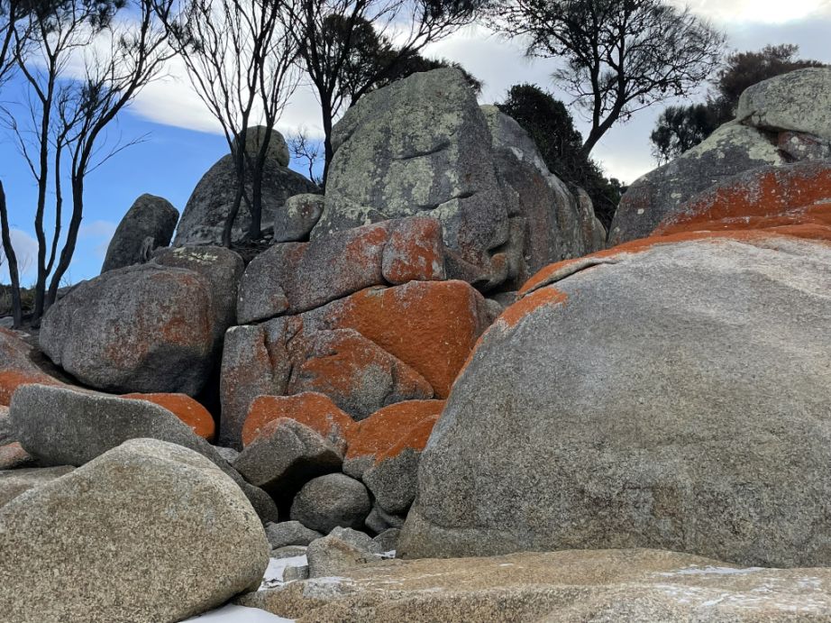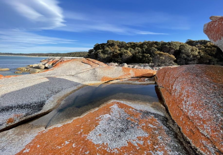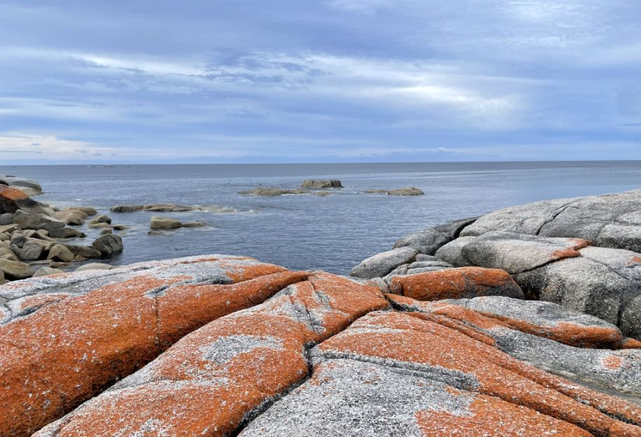 The bright orange pigment is actually a protective compound produced by the lichen to shield itself from the sun’s strong ultraviolet rays and from salt exposure in the coastal environment. Because the Bay of Fires has clean air, steady sea breezes, and little pollution, these lichens thrive, spreading slowly over centuries and giving the rocks their fiery, unmistakable hue. So the “flames” of the Bay of Fires aren’t from fire at all, but from these living, slow-growing lichens that paint the granite with color.