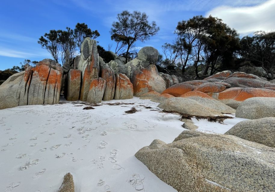 All along the Bay of Fires, the boulders are scattered in a way that feels both natural and sculptural, as if the coastline itself arranged them over time.