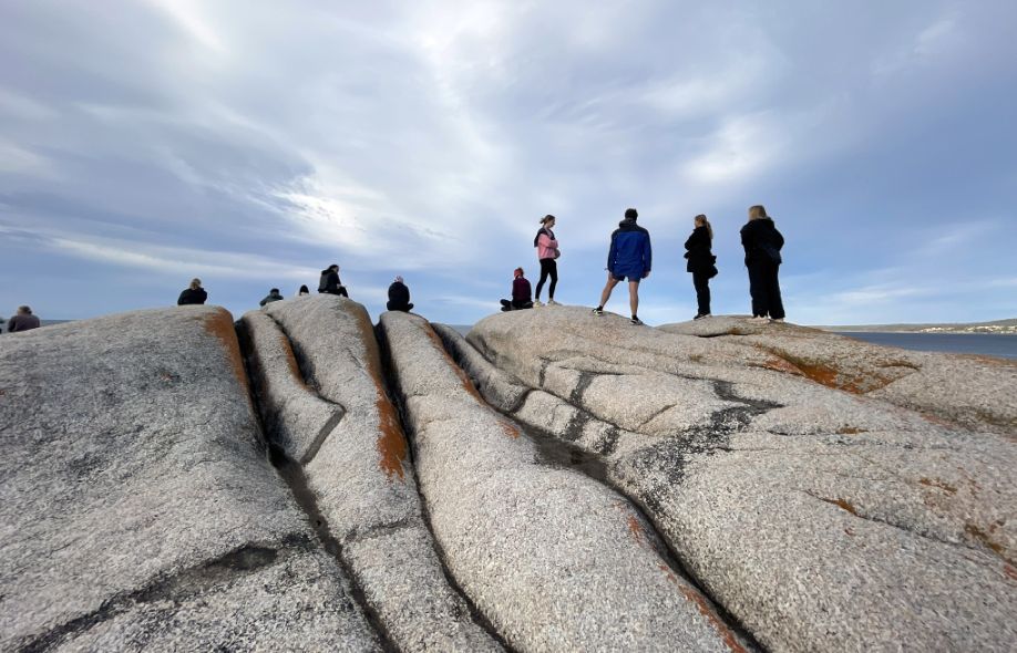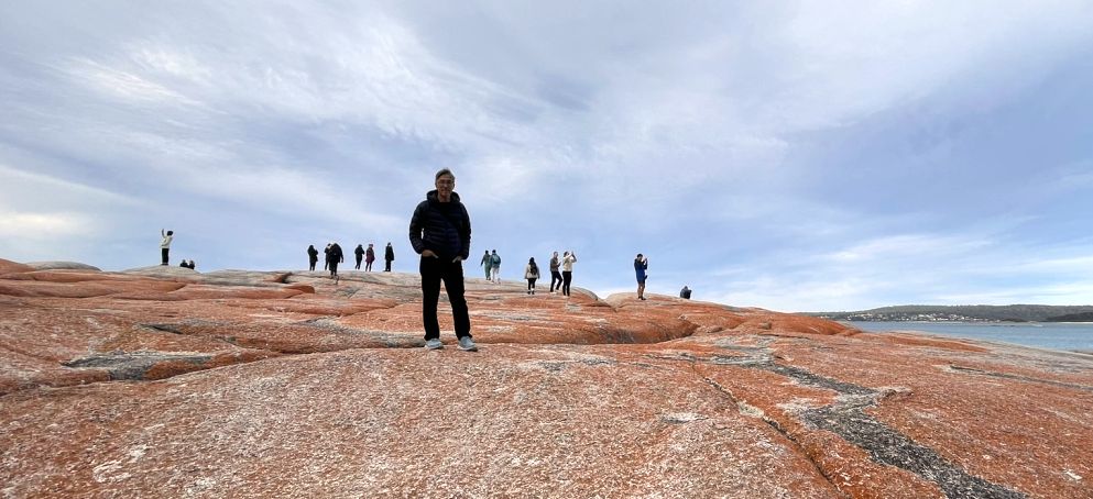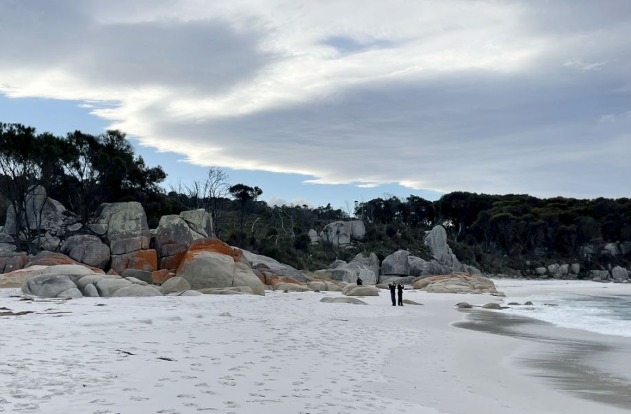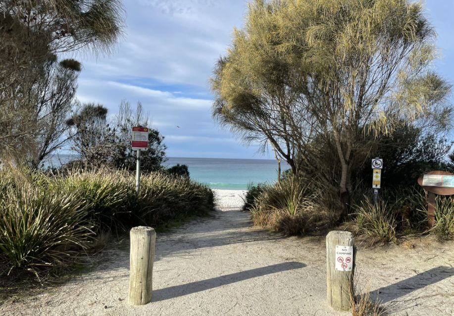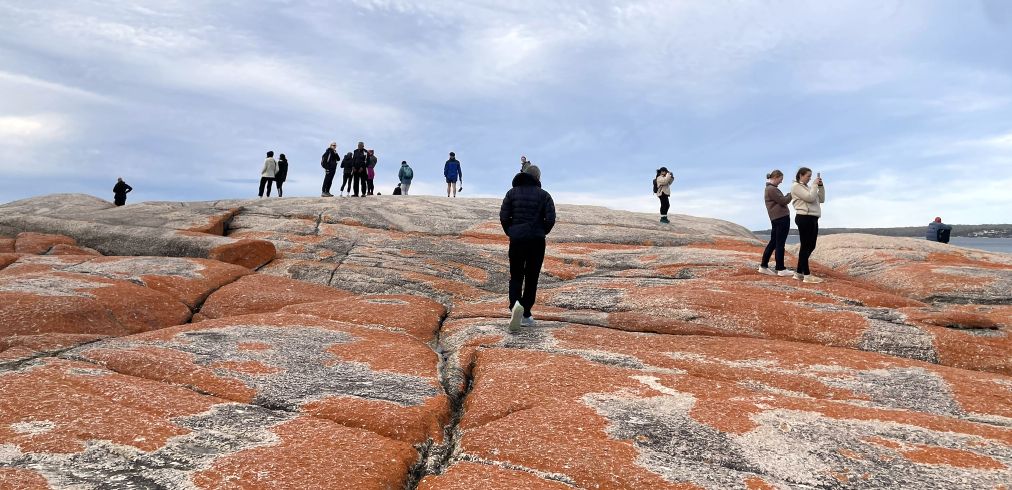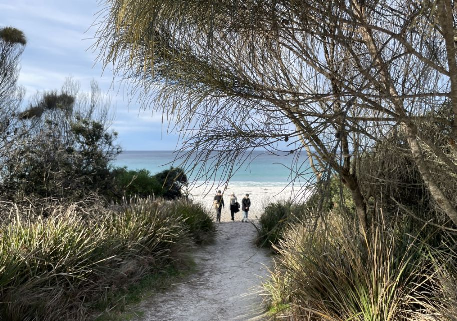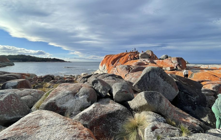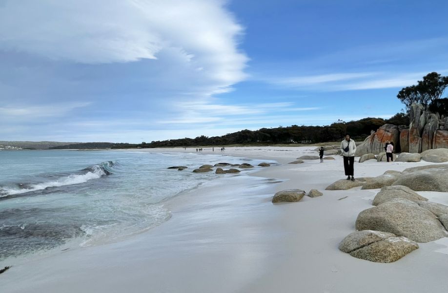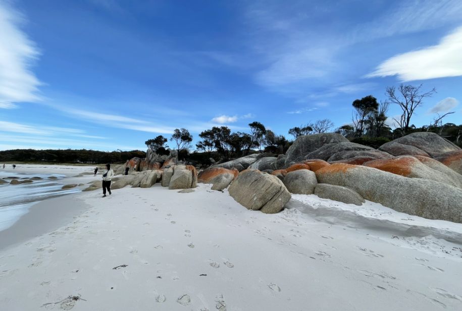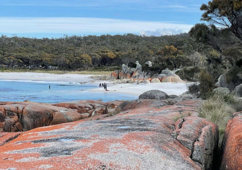 Tom parked the bus and we walked toward the world-famous Bay of Fires Conservation Area where a narrow sandy path opened up to the beach. The entrance was framed by low coastal shrubs and tufts of grass swaying in the breeze. As we got closer, we could hear the sound of waves breaking gently on the shore.