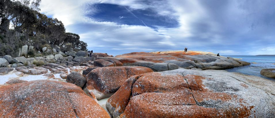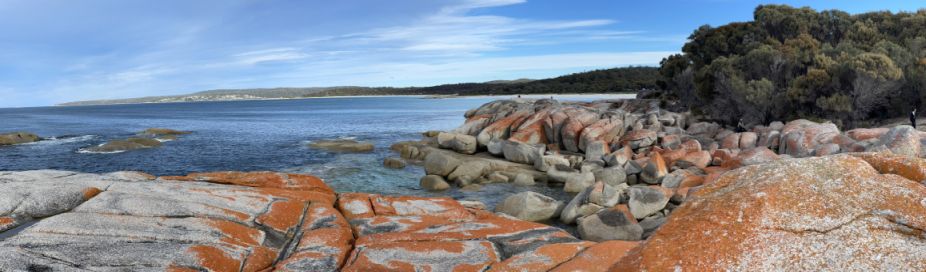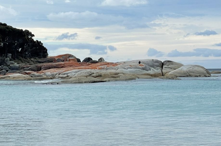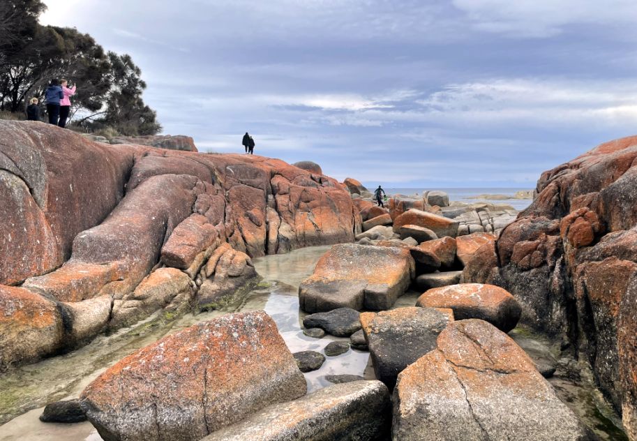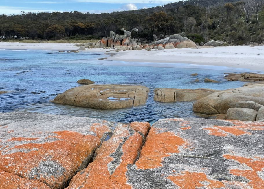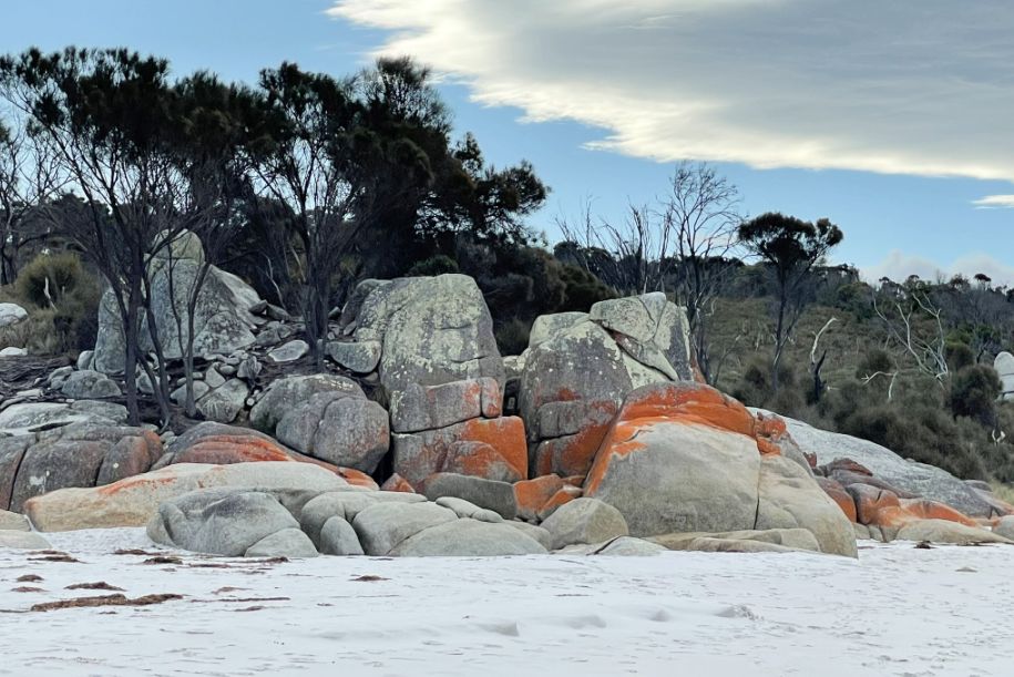 The first impression that the orange lichen looks so much like glowing embers against the white sand that it seems natural to think that’s why the place is called the Bay of Fires. But as I discovered, the name actually has a different origin.