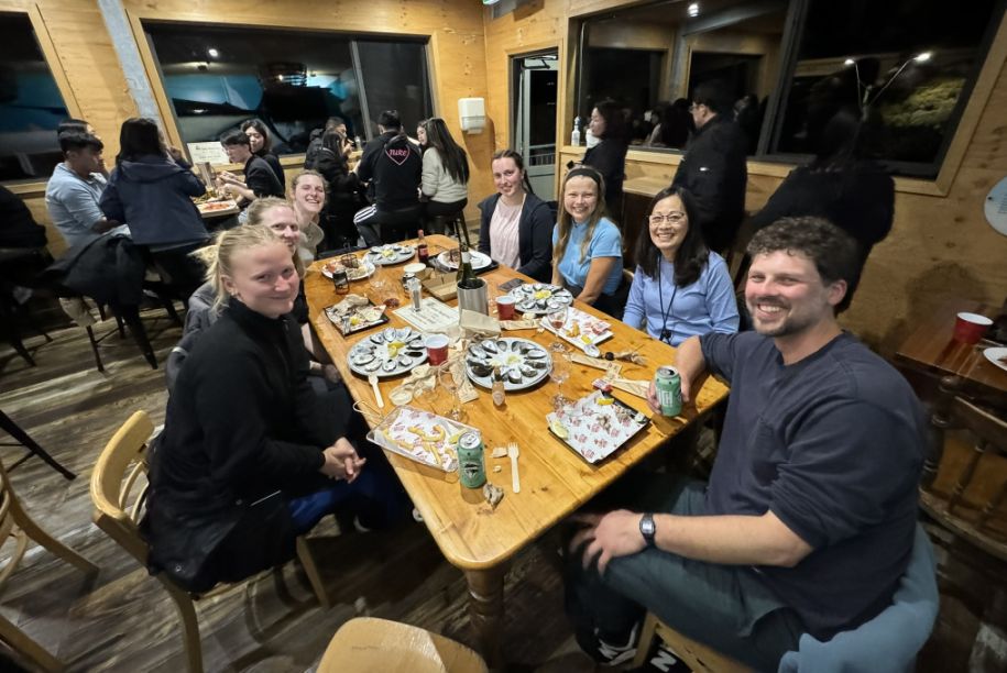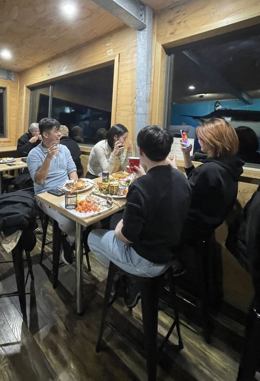 Eifie looked a bit embarrassed as all the attention turned toward her, blushing and laughing as we finished singing and raised our glasses. But even with her shy smile, you could tell she appreciated the gesture. The whole moment felt lighthearted and full of warmth, the kind of spontaneous celebration that makes a trip feel extra special. Between the laughter, the delicious food, and the glow of the evening sky over Waubs Bay, it turned into a truly memorable night, one we’ll all look back on fondly.