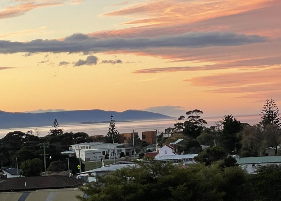 From up here, Bicheno looks peaceful, a quiet coastal town bathed in the golden colors of an autumn evening.